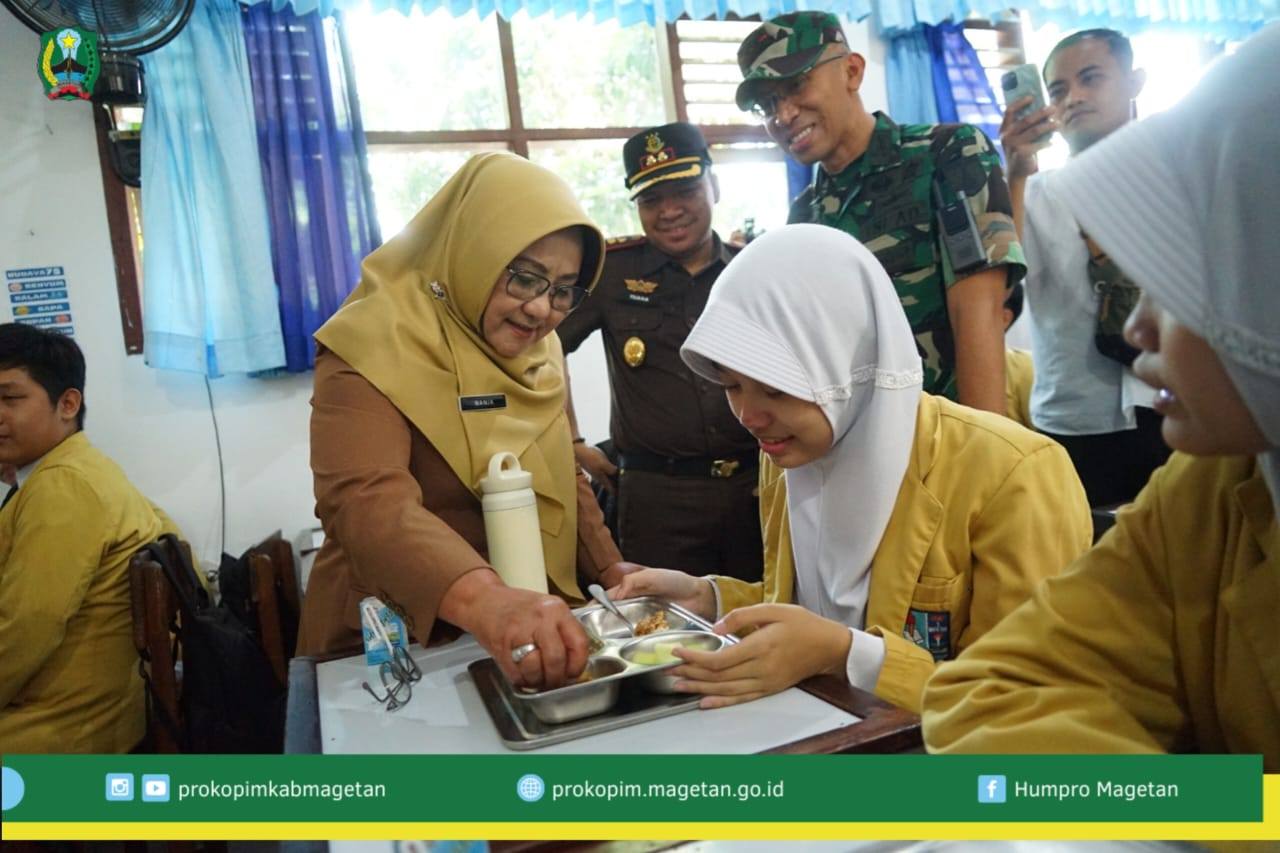 Bupati Magetan Nanik Sumantri bersama jajaran Forkopimda, didampingi Satgas MBG, meninjau pelaksanaan program Makan Bergizi Gratis (MBG), bertempat di SMP Negeri 1 Magetan, Senin (29/09).