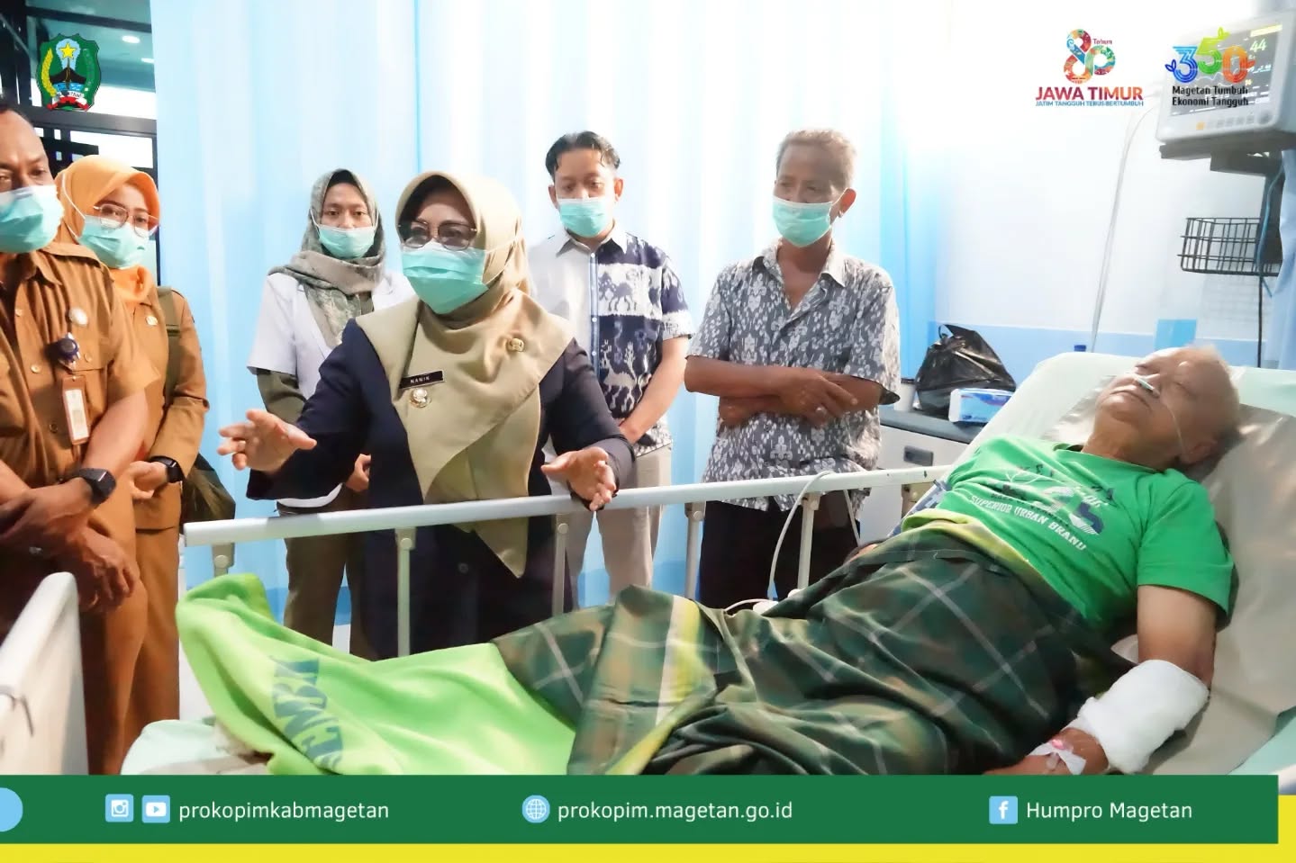 Pagi ini Bupati Magetan, Bunda Nanik, menjenguk pasangan suami istri lansia asal Kelurahan Sukowinangun, Magetan, yang tertimpa musibah ledakan tabung gas LPG di IGD Rumah Sakit Umum Daerah dr. Sayidiman Magetan, Selasa (14/10).
