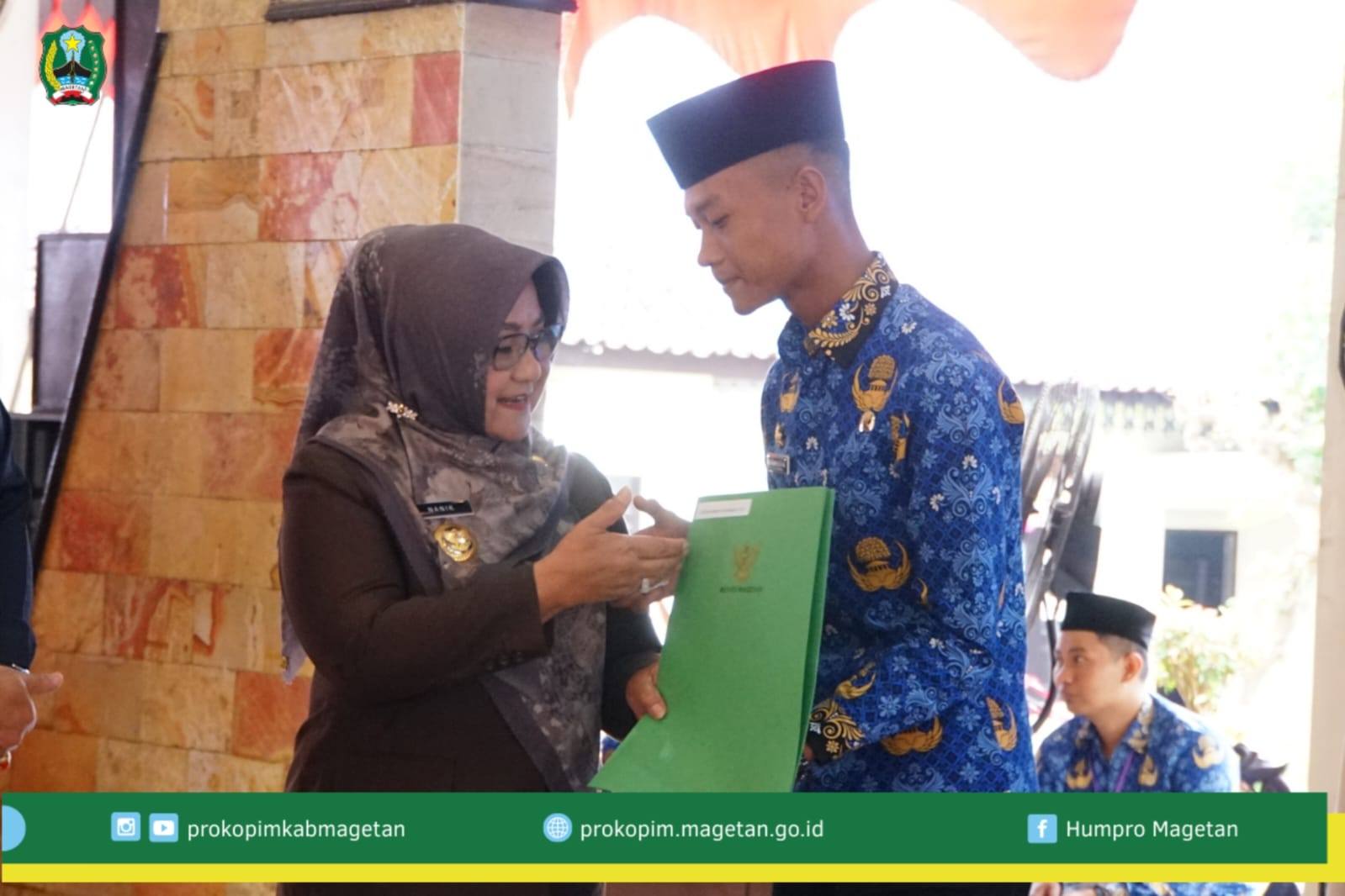 Pemerintah Kabupaten Magetan resmi menyerahkan Surat Keputusan (SK) Bupati tentang pengangkatan Calon Pegawai Negeri Sipil (CPNS) dan Pegawai Pemerintah dengan Perjanjian Kerja (PPPK) formasi tahun 2024. Acara berlangsung di Pendapa Surya Graha pada Selasa (30/9) pagi, dengan dihadiri Bupati Magetan Hj. Nanik Endang Rusminiarti, M.Pd, jajaran pimpinan DPRD, kepala OPD, serta para undangan.