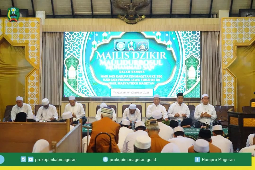 Pemkab Magetan gelar Pengajian Majelis Dzikir Maulidurrosul Muhammad SAW dalam rangka memperingati Hari Jadi ke-350 Kabupaten Magetan, Hari Jadi ke-80 Provinsi Jawa Timur, serta Haul Masyayiekh Magetan, bertempat di Pendopo Surya Graha, Sabtu (4/10).
