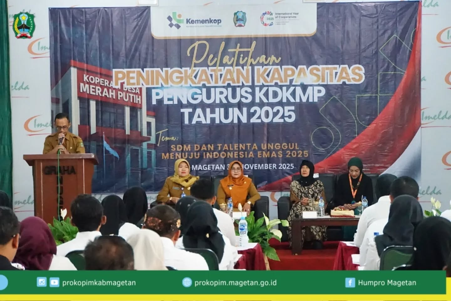 Pemerintah Kabupaten Magetan melalui Dinas Koperasi dan Usaha Mikro menggelar Pelatihan Sumber Daya Manusia (SDM) bagi pengurus Koperasi Desa/Kelurahan Merah Putih (KDKMP) sebagai langkah memperkuat kapasitas dan profesionalitas pengelolaan koperasi di tingkat desa.