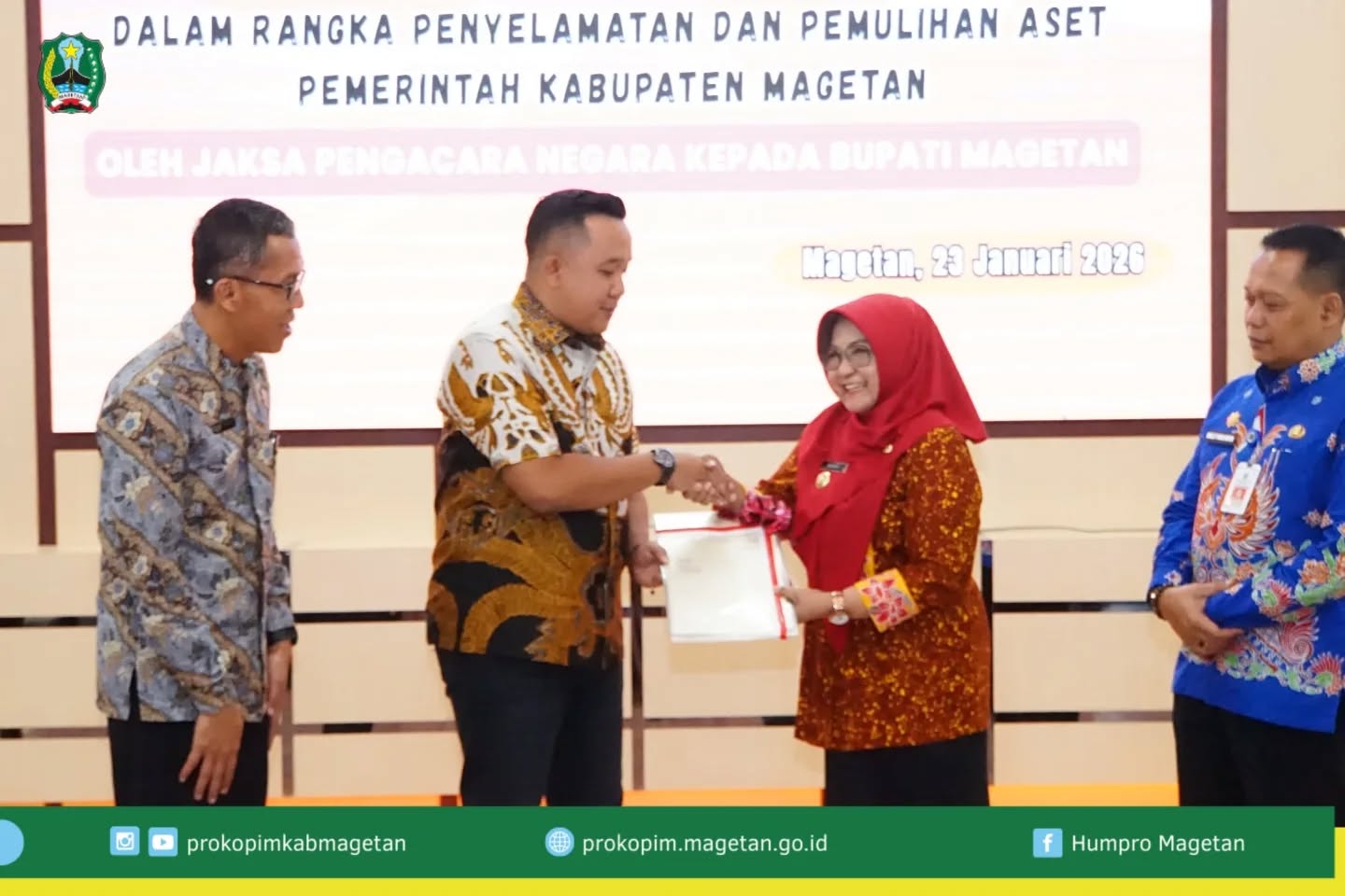 Pemerintah Kabupaten Magetan menerima 11 sertifikat tanah hasil penyelamatan dan pemulihan aset daerah yang diserahkan oleh Jaksa Pengacara Negara kepada Bupati Magetan, Jumat (23/1), di Ruang Jamuan Pendapa Surya Graha.