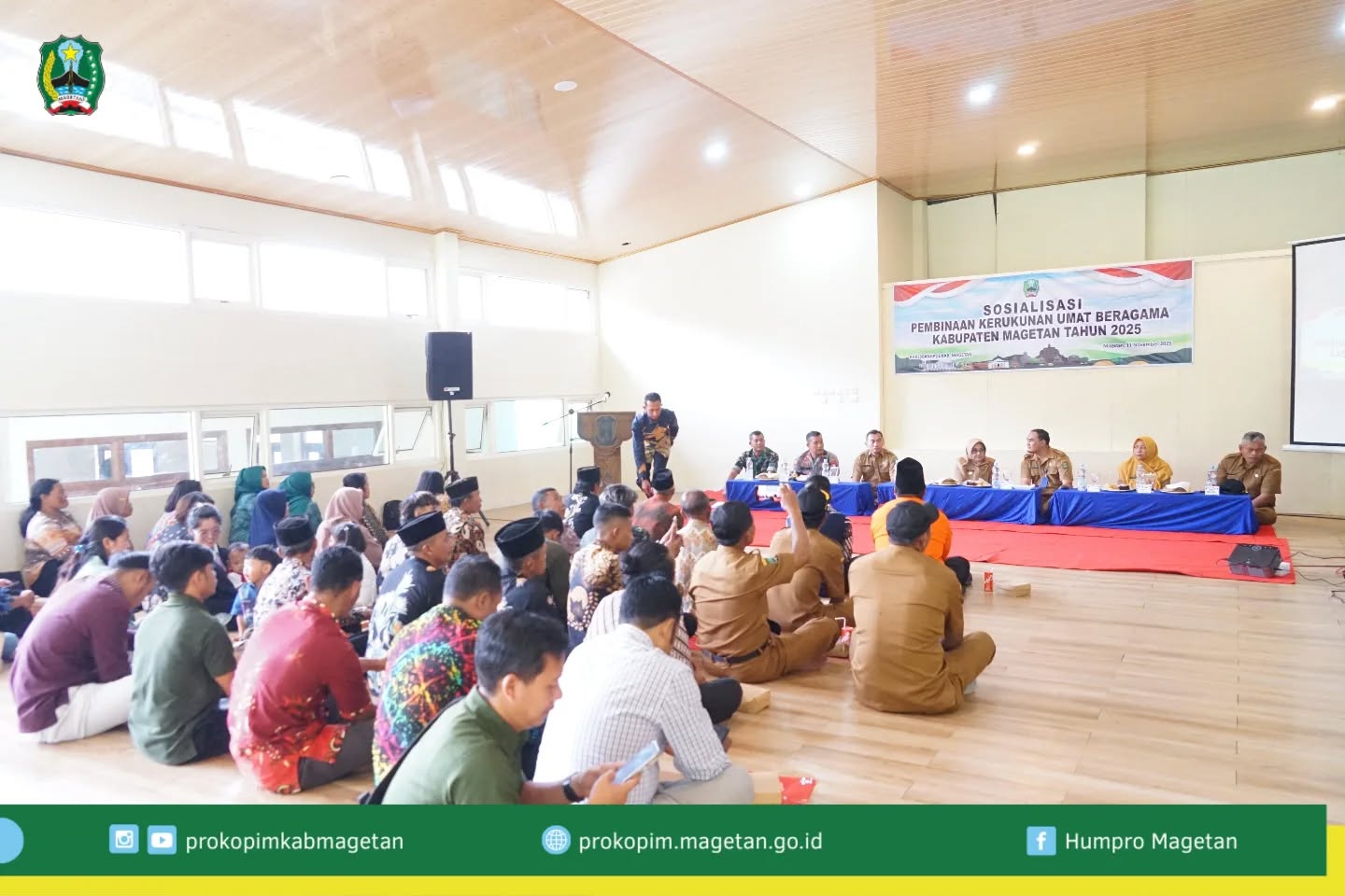 Dalam sambutannya, Bupati Magetan Bunda Nanik menyampaikan di tengah arus globalisasi dan derasnya informasi di media sosial, kita sering melihat gesekan-gesekan yang bernuansa suku, agama, ras dan antar golongan. karena itu, kegiatan sosialisasi ini menjadi sangat penting untuk memperkuat moderasi beragama, komunikasi lintas iman, dan semangat gotong royong di tengah masyrakat.