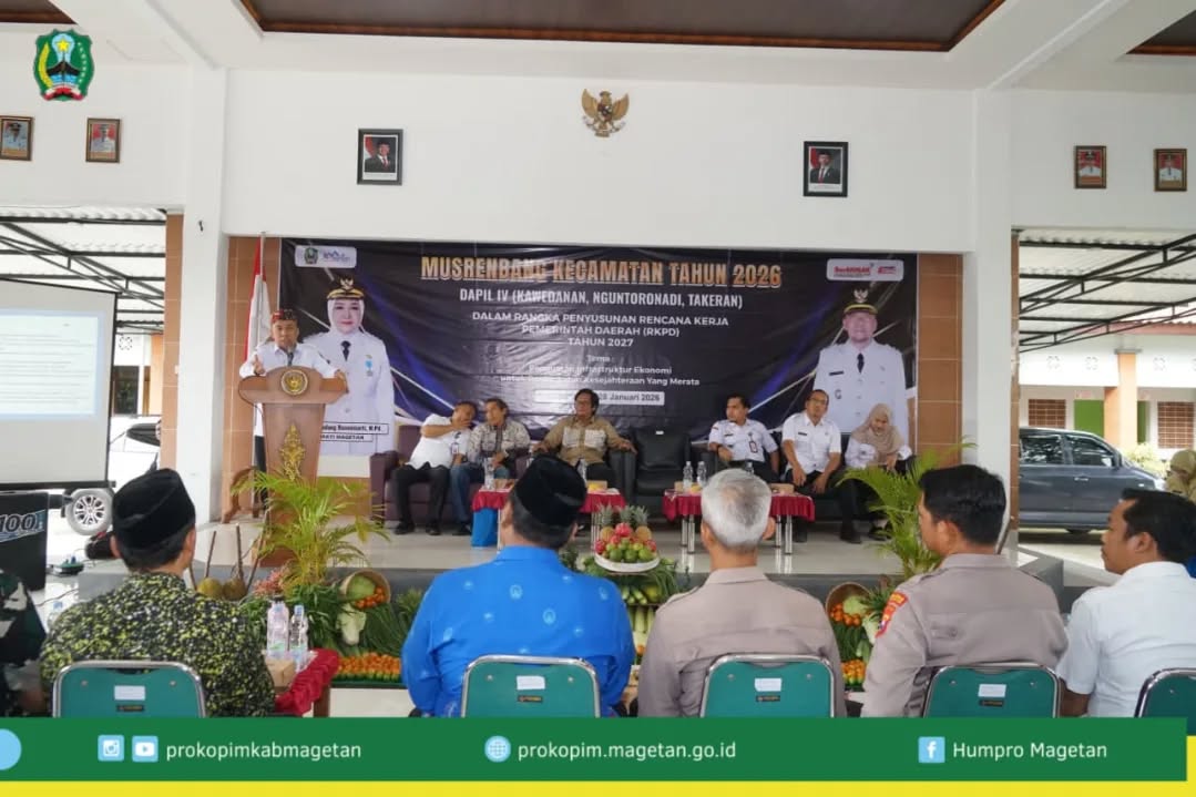 Hari ini, Rabu (28/1) Wakil Bupati Magetan membuka kegiatan Musrenbang Kecamatan tahun 2026 Dapil IV (Kecamatan Kawedanan, Nguntoronadi, Takeran) di Pendapa Kecamatan Nguntoronadi.